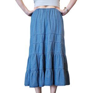 90s Womens Large Denim Jean Tiered Skirt Western Pullon Maxi Long Boho Cowgirl