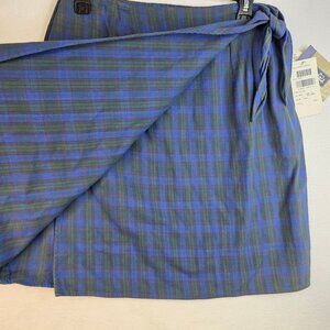 Classic Woolrich women's Tartan plaid wrap skirt, featuring a tie waist, a vivid blue-and-green pattern, made of 100% cotton, tagged size Large, and in new condition with tags.