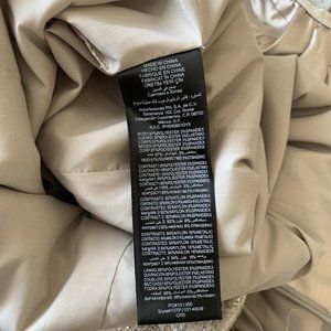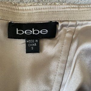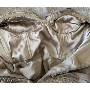 90s Y2K BEBE strapless beige and metallic lace fitted mini party dress. Carrie Bradshaw and Paris Hilton Y2k vibes. Zips up the back. Size small. Excellent preworn condition, one of the bottom fabric wraps hangs down a bit, see photo. Might need a stitch or two.