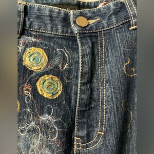 The jeans are a size 6, with a waist size of 30 inches and an inseam of 31 inches. The vintage style and 90s theme add a touch of nostalgia to your wardrobe, making them perfect for a day out or a night on the town. Don't miss out on the opportunity to own these unique and stylish jeans.