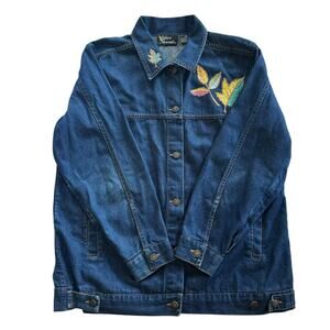 ✨ Vintage 90s vibes! Silver Threads oversized denim jacket with colorful embroidered/appliqué leaf design front & back. Women’s Large. True retro piece — perfect for fall layering, festivals, or cottagecore looks. 100% cotton, soft worn-in denim. Excellent condition.