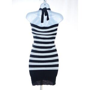 Black and white striped knit dress by Wet Seal. Size Small. Sleeveless, halter style. Made of 100% Acrylic. Stretchy so fits a variety of figures. 28.5" measured from the underarm straight down. Great condition!
