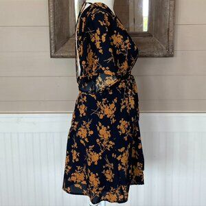 90's Y2K Fit and Flare, Black and Gold Floral Mini Dress Sz Small. Beautiful Black floral, deep V, Dolman Short sleeved mini dress. Ties at waist and in back. Open, sexy back. This dress ids perfect with a jacket for the office/work and right into cocktail hour or dinner. This dress is perfect for summer into fall with its beautiful black and gold floral fabric pattern, but still cool, comfortable and easy to wear. Pack this for your cruise, beach or resort vacation. Preowned in very good condition free of holes, tears or flaws. 32.5 " long, 16.5 " pit to pit.