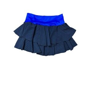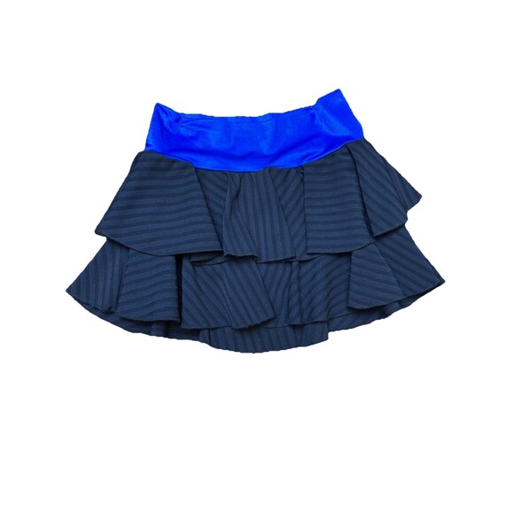 * Details: Black ruffled tiers with diagonal stripes, cobalt blue elastic waist, skort style (skirt + shorts). Classic 90s dancewear vibe!