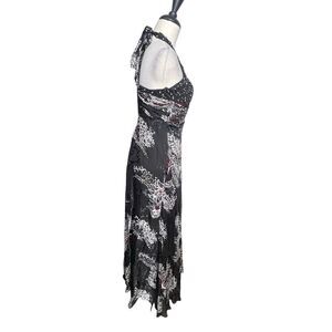Stunning silk gown made of 80% silk and 20% rayon. Features and open back, zipper in the back, padded cups, halter style bust that ties around the neck flowy Skirting and dress is lined. All beading is still intact. Laying flat measures 14.5" from pit to pit, 13" in the waist, and approximately 57" from shoulder to the hem but longer in the back.