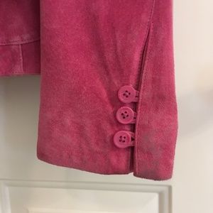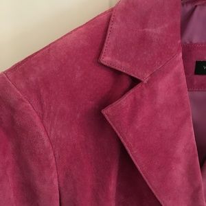 1990s Suede leather jacket in bright pink/fuchsia color. By Valerie Stevens. Blazer style with three pockets, one breast pocket and two waist pockets with flaps. Fitted with darts in front, seams in back with double vent. Single-breasted, three buttons, fully lined. Excellent used condition, some indigo dye rub on the sleeve cuffs. Size Medium.