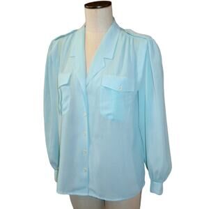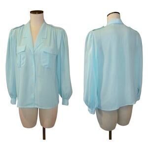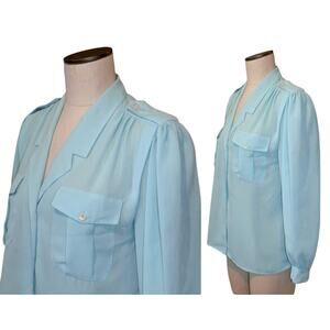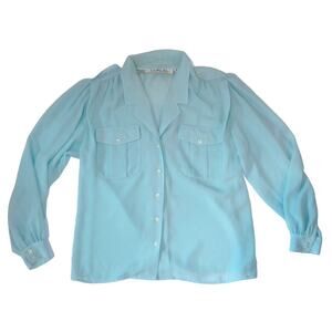Vintage 90s Y2K era crepe polyester semi sheer blouse. Front pockets, epaulettes. Beautiful turquoise color. Color shows best in photo on model. No shoulder pads.