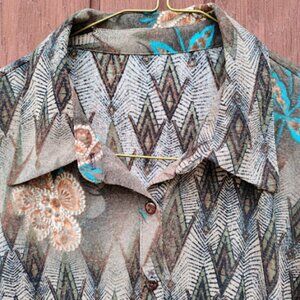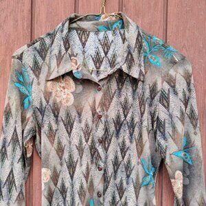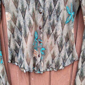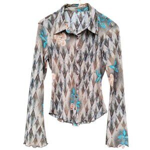 Y2K mesh top, tight sheer blouse, retro geometric print shirt, 2000s mesh top, lettuce hem top, lettuce trim top, boho, bohemian, hippie, vintage-inspired sheer shirt, fairy grunge blouse, indie sleaze aesthetic, fitted mesh button down, funky retro blouse, 70s collar mesh top, sheer embroidered bell sleeve top, button up sheer mesh top, 90s style top, 70s style pattern, flare sleeve top, tight long sleeve crop top, cropped top, fairycore, grunge, that 70s show, 70s print, vintage inspired top
