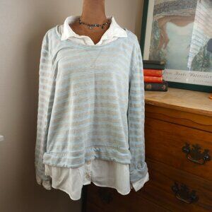 - Built-in layer striped knit sweater over collared shirt hem + cuffs