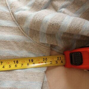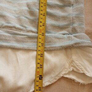 - Pale blue + cream stripe pattern, lightweight cotton-poly knit