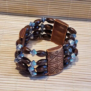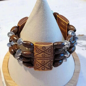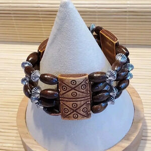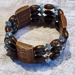 90s Y2K Vintage Boho Tribal Brown Wood Silver Acrylic Beads Stretch Bracelet