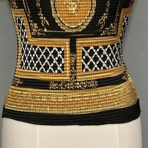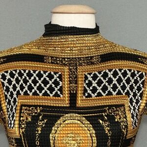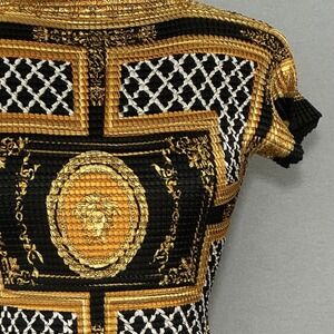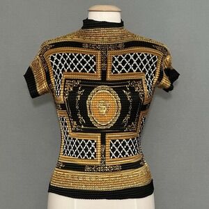 90s Y2K Womens Top M Black Gold Print High Neck Stretch Crinkle Fitted Classic