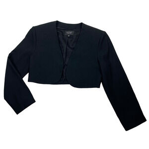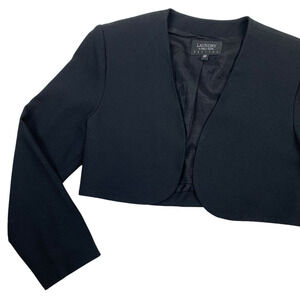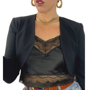 Vintage 1990's black cropped blazer LAUNDRY by SHELLI SEGAL Petites. Made in the USA. 52% Polyester 48% Acetate. Fully lined in black fabric. Can be dressed up or down. Marked size 6 Petite. Measures 15.5" across shoulders, 17" across underarms, 20.5" sleeves, 13.5" down the back. Beautiful vintage condition with minimal signs of wear (see photos).