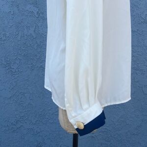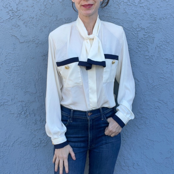 Vintage nautical Blouse with bow my Evan Picone. Has shoulder pads. Gold buttons. Looks cute tucked in. Polyester. Machine washable.