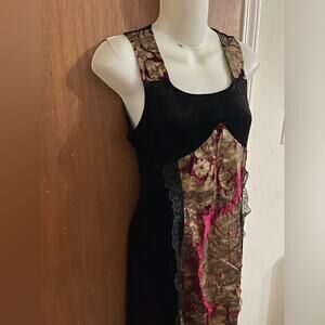 Cyxtees black stretch velvet maxi dress with gold/red brocade panels and lace trim