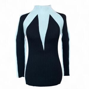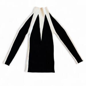 Striking sculptural ribbed knit with bold contrast panels for a mod, retro, indie-vanguard vibe. High neck, body-hugging stretch, graphic lines that lean Y2K, minimal grunge, streetwear chic, and artsy editorial.