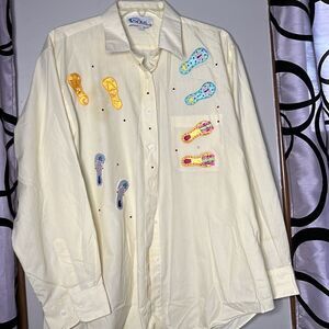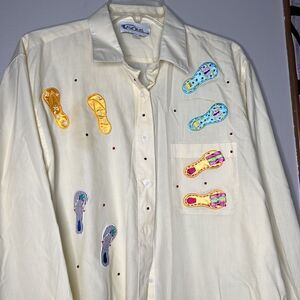 90s vintage Las Olas flip-flop, embroidered sequin, long sleeve, button-down shirt, size large color is a nice soft yellow with appliqué and embroidered flip-flops with sequin Detail, long sleeve, button down, size large