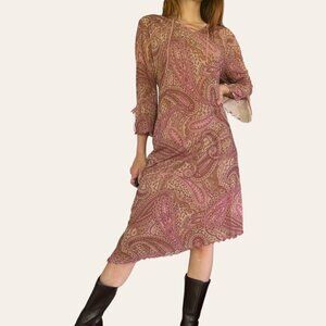 90s vintage boho paisley midi dress by Expressions. Muted pink and tan toned paisley print micromesh with an attached slip. Has a lettuce trim, asymmetric hemline, flared 3/4 length sleeves with tie details, and a lace up v-neck. So cute with knee high boots for a whimsygoth look!