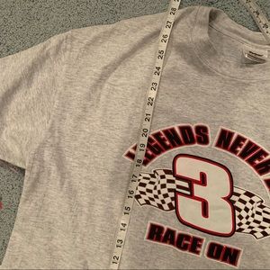 90s vintage Heather grey tee with racing #3 graphic and the words “legends never die/race on” maybe for a nascar racer but idk for sure. Cool sporty piece and easy to wear. Size unisex/mens XL, good condition, has some light colour bleed as pictured.