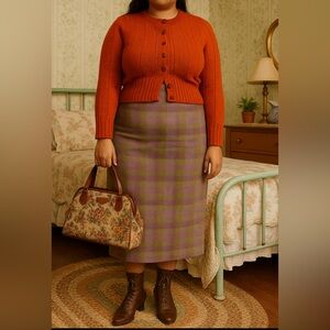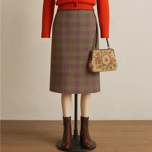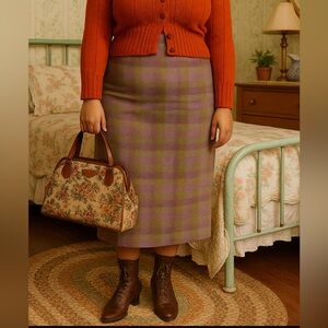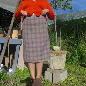 90s vintage purple and green plaid skirt. Midi length. Seems to be handmade. Stretchy waist: Fabric has an almost woolen feel to it. Back slit at the bottom. Fits best a size small to medium.
