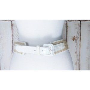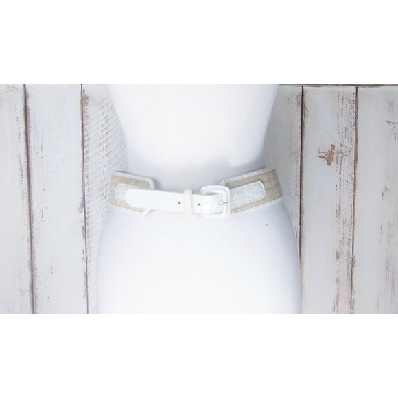 90s vintage white/tan wide straw patent leather belt/reptile embossed