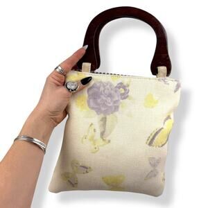 Vintage 1990's woven linen butterfly floral wood handle bag by FASHION EXPRESS ORIGINAL. The cutest little summer bag! Natural linen with yellow and purple printed butterflies and flowers. Gingham purple plain fabric along the top inside. Natural wood handles. Inside is clean white fabric with a small zippered pocket with designer logo. Measures 9.5" along the top, 10" along the bottom, 10.25" tall. Strap drop measures 4.5". My IPhone 16 fits inside perfectly with plenty of room for extras! Excellent vintage condition with some minimal signs of wear, only small flaw to note is a tiny stain in the inside by the pocket (see photo).