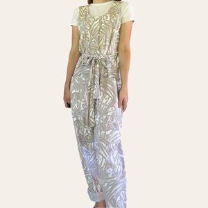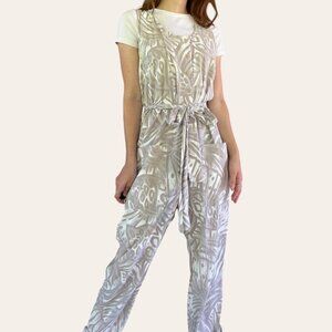 90s/2000s boho patterned vintage jumpsuit. No tags/branding. Features tank straps, loose fit, straight legs, a button down front, two large front pockets, and a tying waist as well as an all-over abstract beige & white print. Lightweight and perfect for summertime! **White shirt not included