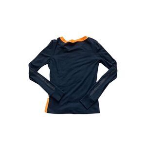 Bold and funky 90s Cachet long sleeve top featuring a rhinestone-studded high heel graphic with “My Dreaming! Go on” slogan. Designed with black stretch cotton fabric, orange and beige colorblock accents, and sequin stripes down each sleeve. Crew neckline and slim silhouette.