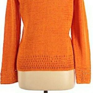 Vibrant bright orange non-itch scoop neck 6 button open knit crochet hem and sleeve detailed cardigan by Coldwater Creek.