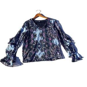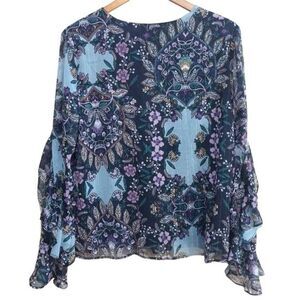 90's Iz Byer Boho Ruffled Bell Sleeve Metallic Threading FLoral Blouse Blue Sz L