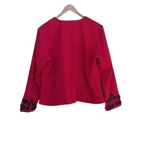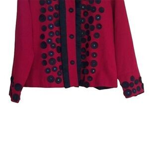 Red jewel mandarin collared Nehru vintage jacket blazer button down with black polka dot adornments and ruffle edging by Notations.