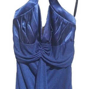 Navy halter plunging V satin pleated bustier empire raw edge ruffle draped front mini dress by Roberta vintage 90's.
