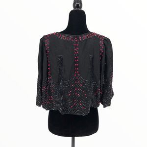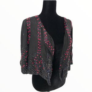 Super unique piece, black fabric that has a sheen to it, with black iridescent beads and solid red beads including inside lapel. No closures, meant to be worn open to show the beaded detailing. Elbow length sleeves, cropped length overall.
