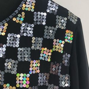 Gorgeous silk evening jacket, with a checkerboard of sequins that flash silver and gold/iridescent. Solid sleeves, one hook and eye closure at neckline. This is perfect for dressing up a pair of jeans or over an LBD for the holidays/New Years. Silver beaded trim at neckline, cuffs, and hem.