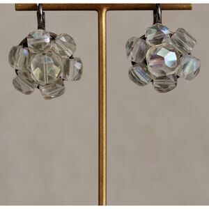90s Vintage Womens Chunky Clear Rhinestone Cluster Clip On Earrings Retro Floral