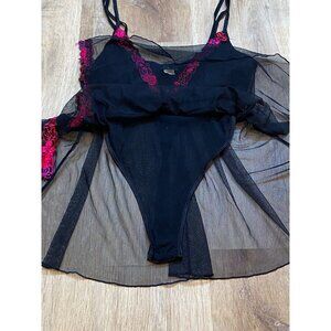 90s/Y2K Fredricks of Hollywood Black Sheer Babydoll Lingerie With Bright Pink Fl