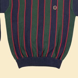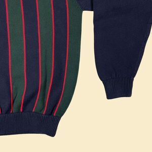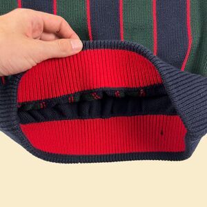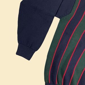 Vintage crewneck knit sweater, manufactured ca. 1990s by Tommy Hilfiger. Blue, red, and green striped sweater with solid blue arms, featuring a color-block pattern and vertical stripes. Size L.