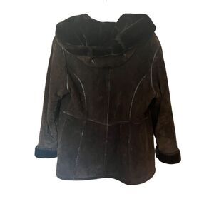 This Wilson's Leather Suede Hooded Coat / Jacket features a soft and cozy faux-sherling lining and comes in a rich chocolate brown. It has an