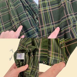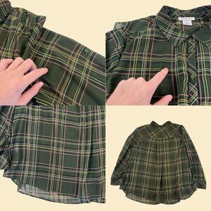 Vintage sheer button down blouse, manufactured ca. 1990s - early 2000s by Roamans. Plaid green, lime green, pink, and white blouse with sheer fabric, a front pocket, long sleeves, and button-down closures. Size 30W.