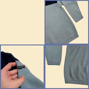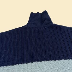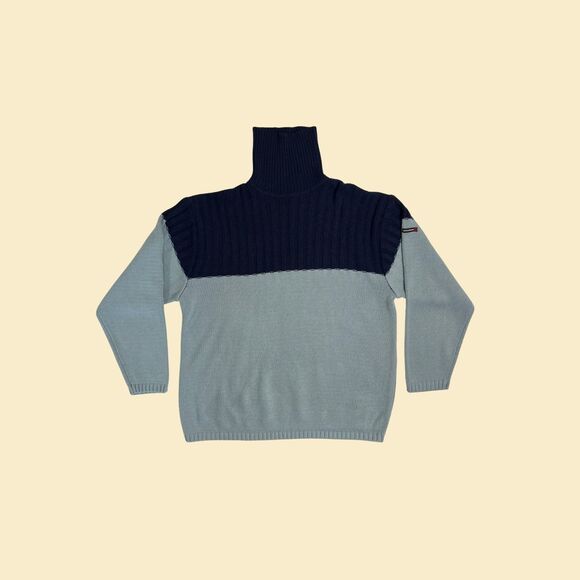 Vintage turtleneck sweater, manufactured ca. 1990s - early 2000s by NorthPeak. Pullover colorblock dark blue and light blue knit sweater with a Northpeak patch on one of the arms. Size XL.