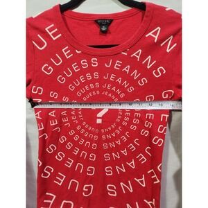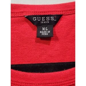 This product is a vintage Guess Jeans shirt from the 90s or Y2K era, featuring the brand's spell-out logo in red. It has a long sleeve, round neck, and is made of cotton. The slim fit and cropped style give it a trendy and retro look, perfect for those who love the 90s theme. This shirt is a medium or large size for women, ideal for casual wear or adding a touch of nostalgia to any outfit.