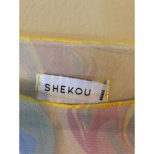 This beautiful 90s styles blouse is he threw and would look great with a bralette underneath it paired with wide leg pants for a night out on the town. Item is a size small, however, can fit up to a medium and large due to its great stretch.