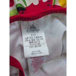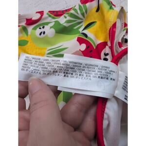GUC Disney ruffled swimsuit. White with colorful fruit print. Ruffle across the bodice. Cut-outs on the sides. Adjustable straps. Fully lined. Light overall wash wear, listing in GUC for light pilling on the front and tiny black specs throughout