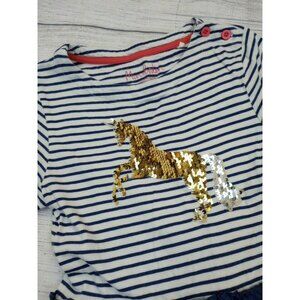 VGUC Mini Boden flip sequin dress. Blue and white stripe bodice with gold/silver sequin unicorn. Two pink buttons on the shoulder. Navy blue skirt with pockets. Skirt is lined. Light wash wear