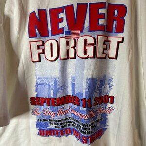 Honor a pivotal moment in American history with this poignant 911 Memorial TShirt, a tribute to the resilience and unity of the nation. This classic T-shirt features a powerful graphic commemorating September 11, 2001. Crafted from high-quality materials, this shirt is comfortable and durable for everyday wear. The core color of the shirt is a clean, crisp white that makes the multicolored print on the front stand out. A touching scene depicted below the date shows the American flag and an eagle, symbolizing the country's spirit and remembrance. Below the graphic is a heartfelt message that resonates with many: 'In Dedication and in Honor to those we lost that day, to the brave Military, Firefighters, Law enforcement, Emergency personnel, and volunteers who came to our nation's call, and for the innocent lives lost and affected by this tragic event. WE WILL NEVER FORGET.