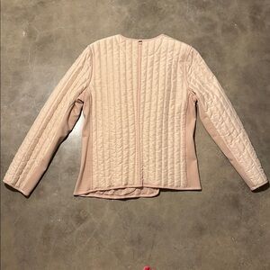 100% silk blush pink quilted jacket by 9/15 for Saks Fifth Avenue. Has two tiny holes on the lining (pictured) and some very light pilling but otherwise excellent used condition.