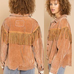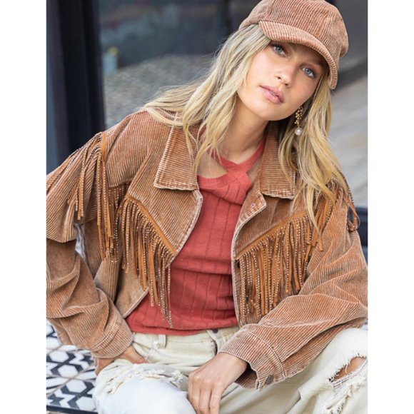 Exude a bohemian charm with our Fringed Corduroy Jacket. The fringe detail, adorned with metallic studs, adds a unique touch to this button front jacket. The partial raw hem and washed finish complete the vintage look. Stay stylish and on-trend with this must-have piece.