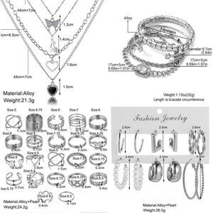Features: Includes 8 necklaces, 19 bracelets, 44 stud or hoop earrings, and 21 knuckle rings. Each piece is lightweight, making it super comfortable for all-day wear. High-quality alloy with great color durability, eco-friendly too!