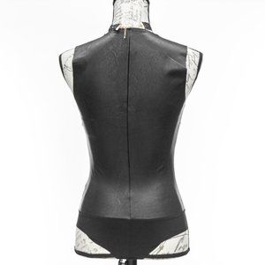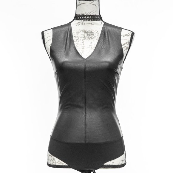 Commando black Faux leather, deep v-neckline, stretch bodysuit