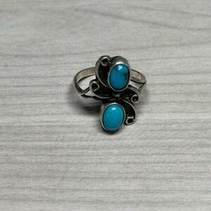This striking silver ring showcases two vibrant blue turquoise stones, set in a unique asymmetrical design. The oval-shaped stones are securely held in a bezel setting, offering a modern twist to a classic piece. Perfect for adding a touch of elegance and color to any ensemble.